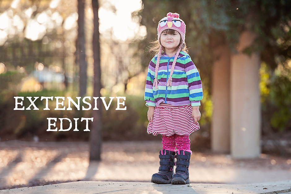 Additional retouching services are available starting at $50 per hour for more extensive edits. See photos below for an example. The first photo is unedited, the second photo only has basic retouching and the last photo has a more extensive edit.